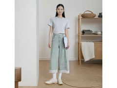 溫碧霞代言IRENENA服裝春季新款蕾絲藍色闊腿牛仔褲
